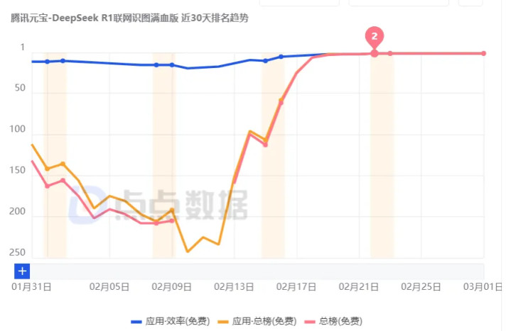 目前,腾讯元宝是AIGC应用中用户增长最快的App。2月22日,腾讯元宝在中国区苹果应用商店免费App下载排行榜上猛地上升了100多名,排名超越豆包,仅次于DeepSeek。